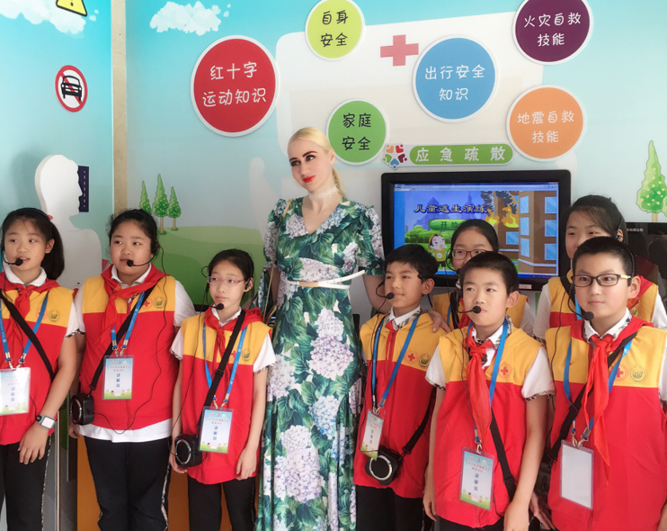 小朋友热情欢迎国际友人的到来,并逐一演示了红十字会承建展示的小学生防预和救生救护教育示范,并邀请了大家一起参与互动。