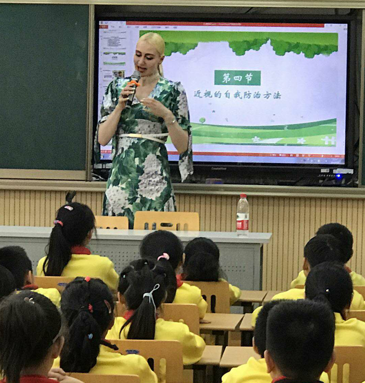 汤亚莉对孩子们说: “我有一双可爱的龙凤胎儿女,在刚出生时,由于吸氧过渡,导致眼膜充血脱落,差一点就变成了盲人,是中国的医生救了他们,在 2013 年,我有了车祸,在医院抢救 180多天,生命危在旦夕,后来是中国的中医让我渡过了难关,所以我非常的爱中国,有很多的中医活动我都是积极参加。小朋友们一定要爱护好自己的眼睛,少看电视和手机,多注意休息,离书本要保持一定看书距离,平常要多吃红萝卜等新鲜瓜果蔬菜。”